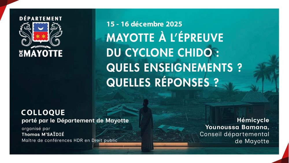 Le Département de Mayotte a le plaisir d’annoncer la tenue d’un colloque international majeur intitulé « Mayotte à l’épreuve du cyclone Chido : Quels enseignements ? Quelles réponses ? ». Cet événement se déroulera les 15 et 16 décembre 2025 à l’Hémicycle Younoussa Bamana.