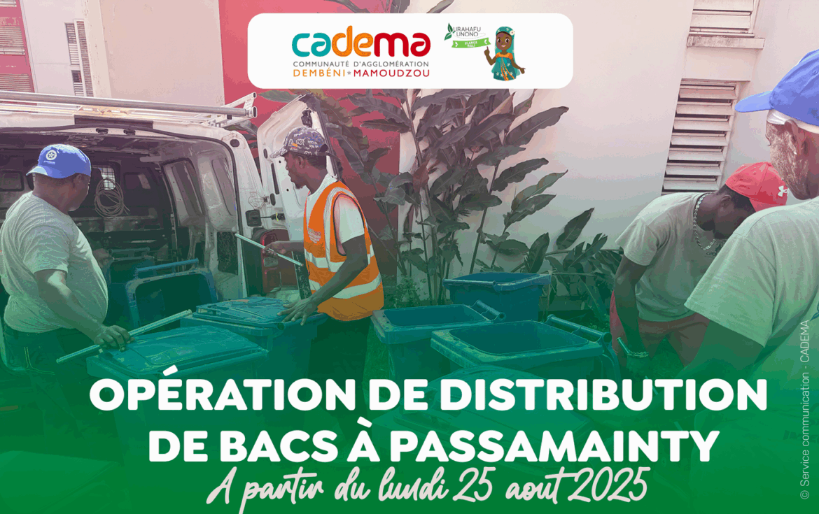 La Communauté d’Agglomération Dembéni-Mamoudzou (CADEMA) poursuit ses efforts pour renforcer la gestion et la collecte des déchets sur son territoire. Dans ce cadre, elle organise une nouvelle opération de distribution de bacs à ordures à Passamainty, afin de faciliter l’accès des ménages à des équipements adaptés et de promouvoir de meilleures pratiques environnementales.