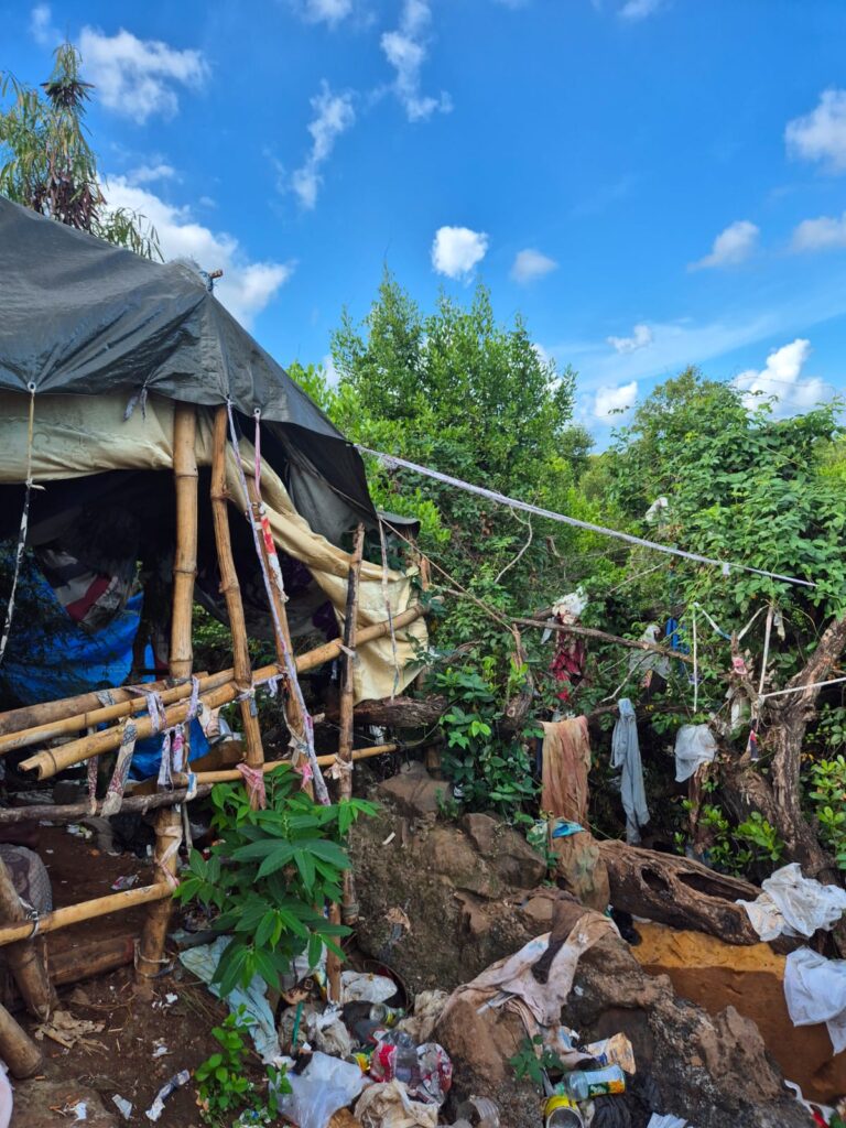 À Tsoundzou, les images du camp de migrants témoignent d’une réalité difficile, marquée par une insalubrité généralisée. Sur place, les abris de fortune, construits avec des bâches et des matériaux récupérés, s’intègrent dans un environnement dégradé où les déchets s’accumulent à même le sol.