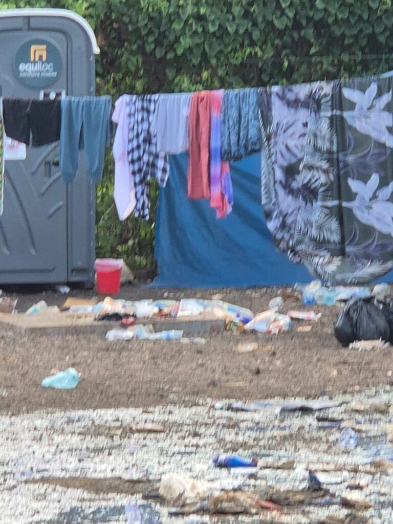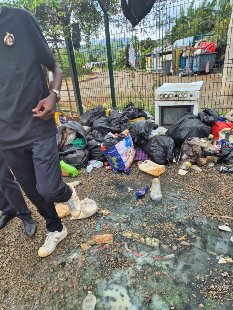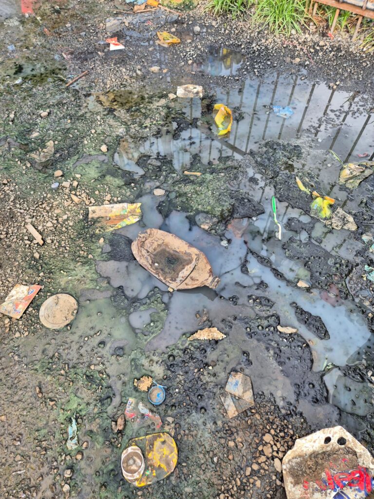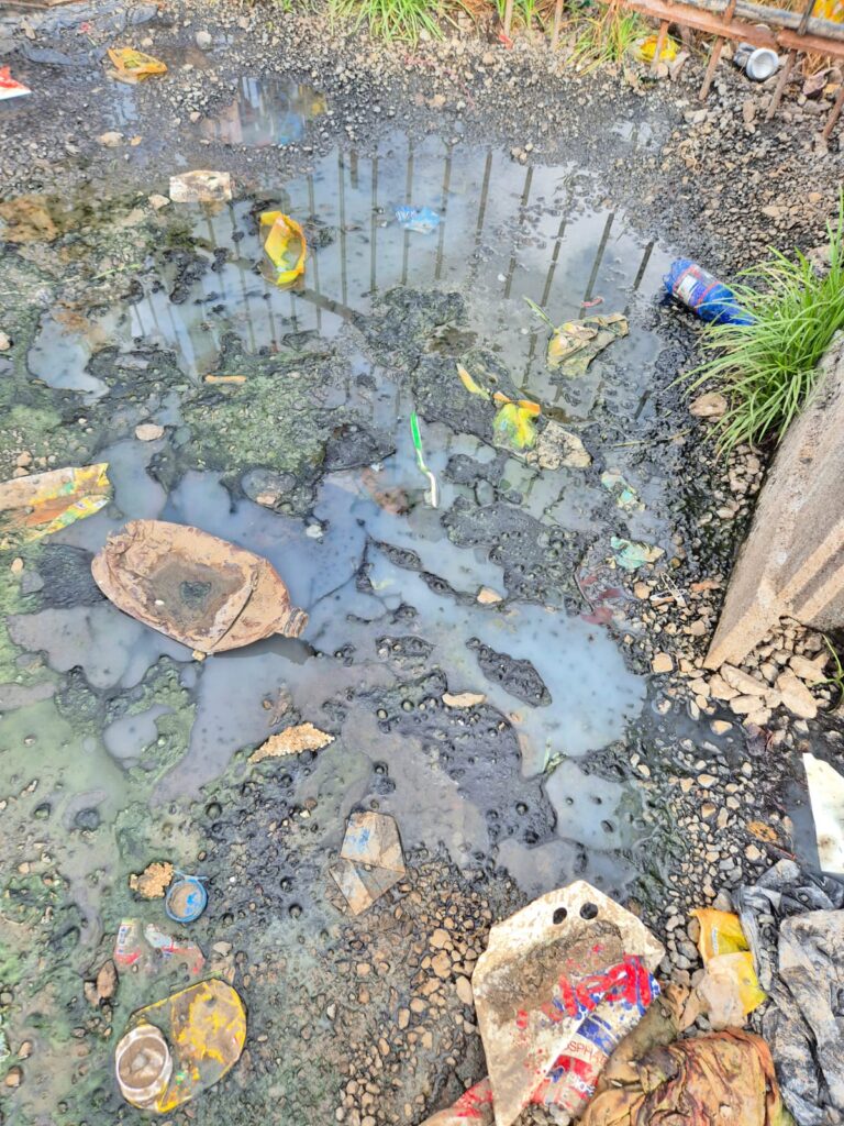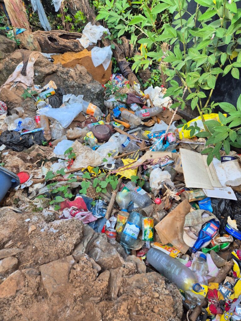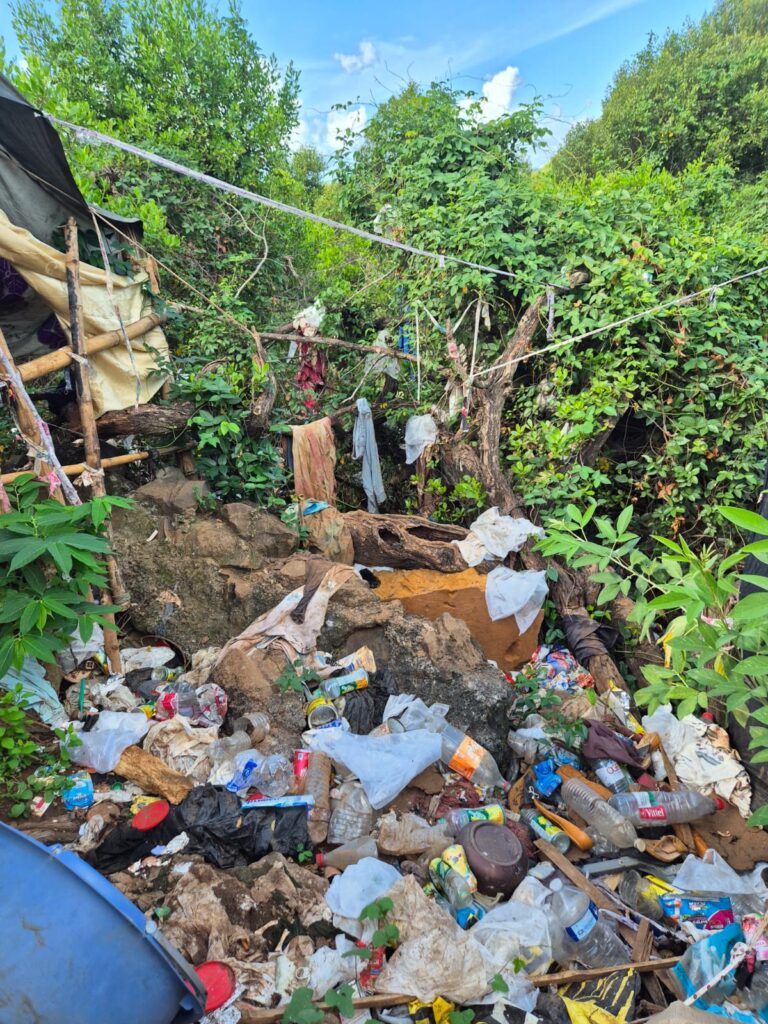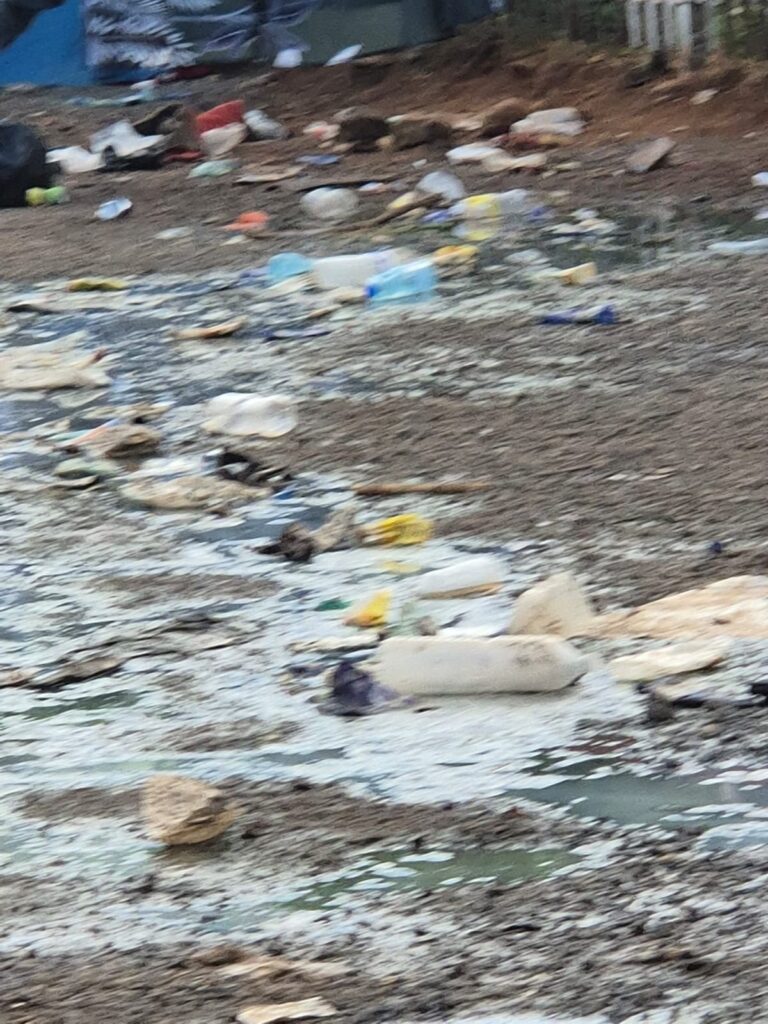 Bouteilles en plastique, sacs, restes alimentaires et objets divers jonchent les abords du camp, parfois mêlés à la végétation ou entassés dans des zones déjà fragiles. Plusieurs clichés montrent également la présence d’eaux stagnantes mêlées à des détritus, formant des mares verdâtres susceptibles de poser de graves risques sanitaires.
